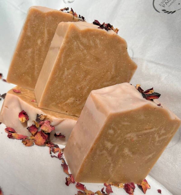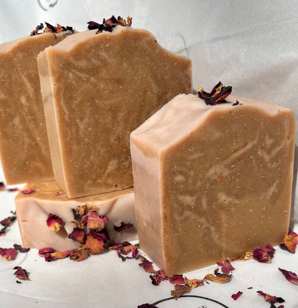 Our rose soap comes with our base soap then we add rose essential oil, and rose powder, and top of with rose petals.