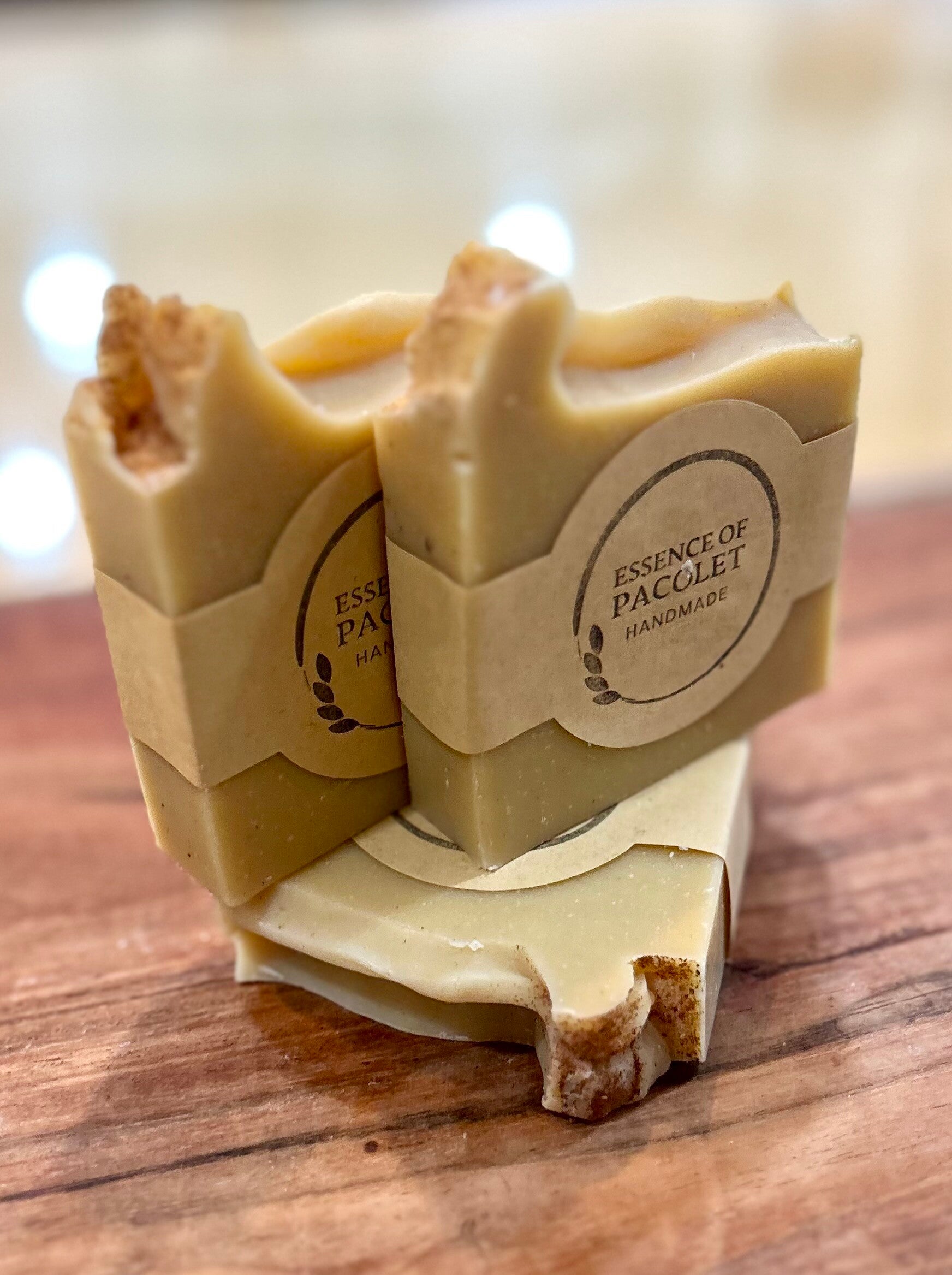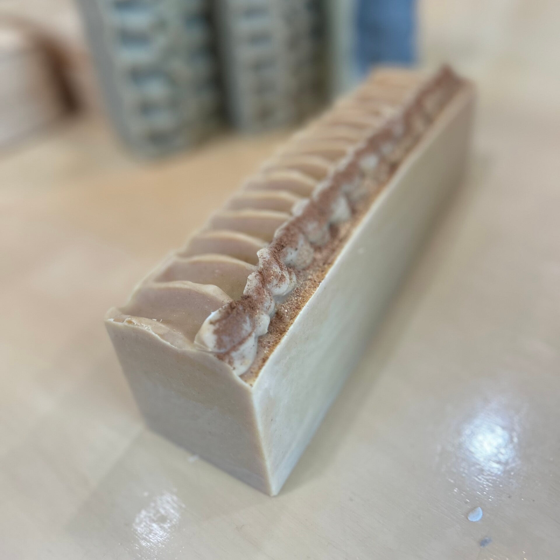 Ingredients; coconut oil, evoo, palm oil, lye, h2o, orange EO, clove EO, cinnamon EO, turmeric powder, orange peel powder cinnamon powder. Please do a test patch on a small area first. DO NOT EAT!